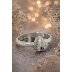 Der Ring ist aus 925er Sterling Silber und natürlich auch so gestempelt. Besetzt ist der Ring mit 1 sehr schönen Amethyst, eingearbeitet in einem Herz. Die Ringschiene und das Herz wurden matt gebürstet.