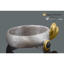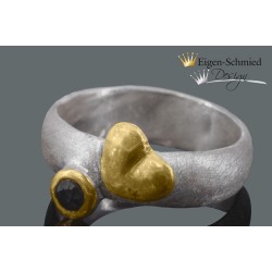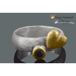 Der Ring ist aus 925er Sterling Silber und natürlich auch so gestempelt. Besetzt ist der Ring mit einem sehr schönen Saphir und einem Herz, diese wurden zusätzlich vergoldet. Das herz und die Steinfassung sind glänzend poliert. Die Ringschiene ist matt gebürstet.
