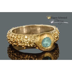 Der Ring besteht aus 925er Sterling Silber mit einer 22 karätigen Goldplattinierung. Besetzt ist der Ring mit  einem sehr schönen blauen Topas. Die Oberfläche der Ringschiene ist in Struktur gearbeitet und die Fassung des Edelsteins ist matt gebürstet.