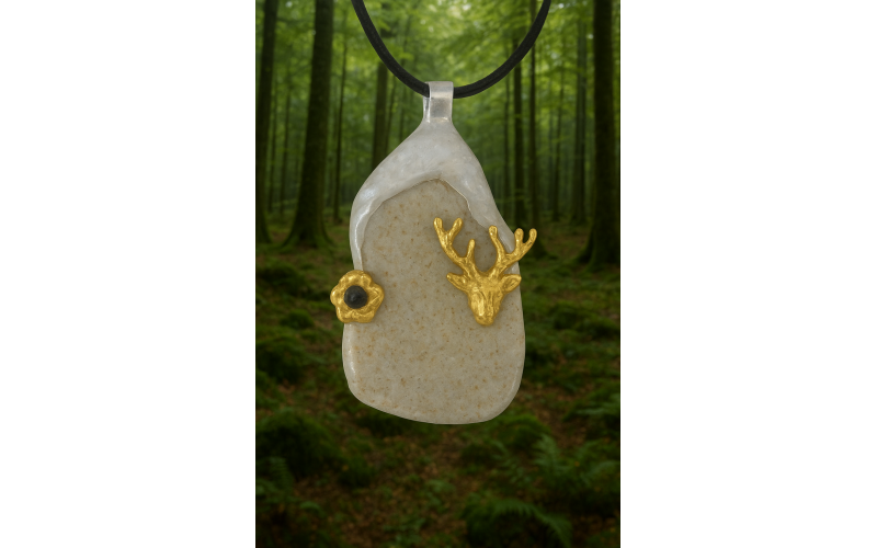 Der Anhänger ist aus 925er Sterling Silber und natürlich auch so gestempelt. Der Stein ist in Silber gefasst. Die Steinfassung und der Hirsch wurden zusätzlich vergoldet.