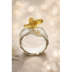 Der Ring ist aus 925er Sterling Silber, der Schmetterling wurde zusätzlich vergoldet. Besetzt ist der Ring mit einem Schmetterling und 1 sehr schönen Süßwasserperle. Die Fassung der Perle, sowie in die Kanten des Ringes wurden außergewöhnliche Diamanteffekte eingearbeitet. Diese speziell bearbeiteten Flächen sehen aus, als wenn sie mit tausend kleinen Diamanten besetzt wären.