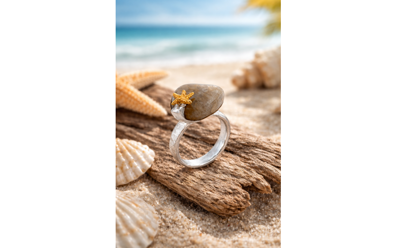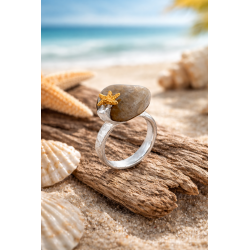 The ring is made of 925 Sterling silver jewelled with a stone from the baltic sea and a shell. The starfish is additionally gold plated.